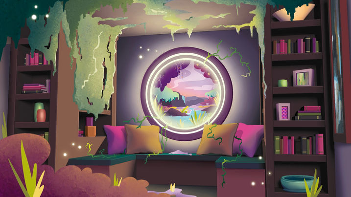 These backgrounds were constructed in Maya using only primitive shapes and brought into Photoshop or Procreate for painting.